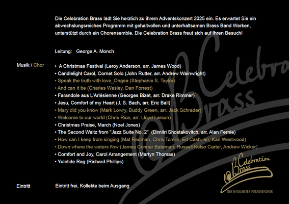 Unser diesjähriges Adventskonzert mit der Celebration Brass steht ganz im Zeichen der klassischen Weihnachtsliteratur und reicht vom Weihnachtsmedley "A Christmas Festival" über bekannte Klassiker wie "Farandole" und "Jesu, meine Freude" bis hin zur modernen Interpretation von "God Rest Ye Merry, Gentlemen".
